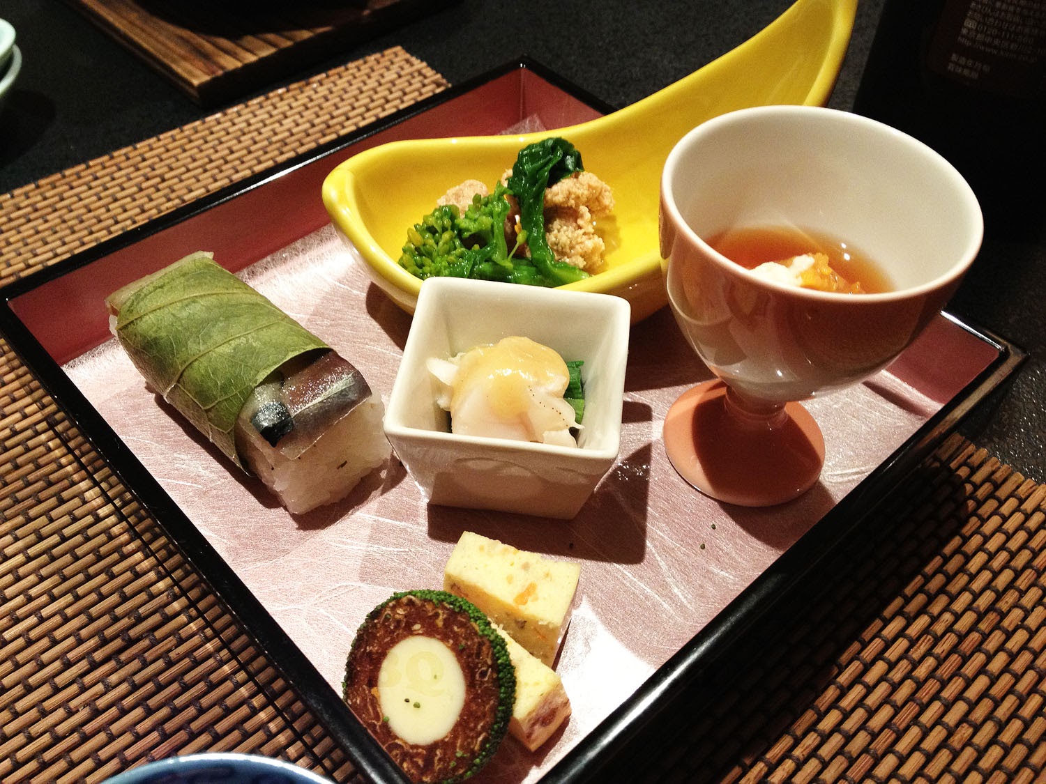 而前菜旁則是放了白酒當餐前酒。前菜共有6種,分別有握壽司(鯖魚?)、日式煎蛋、帆立貝,以及三種好吃卻吃不出是什麼食材做成的精緻料理><