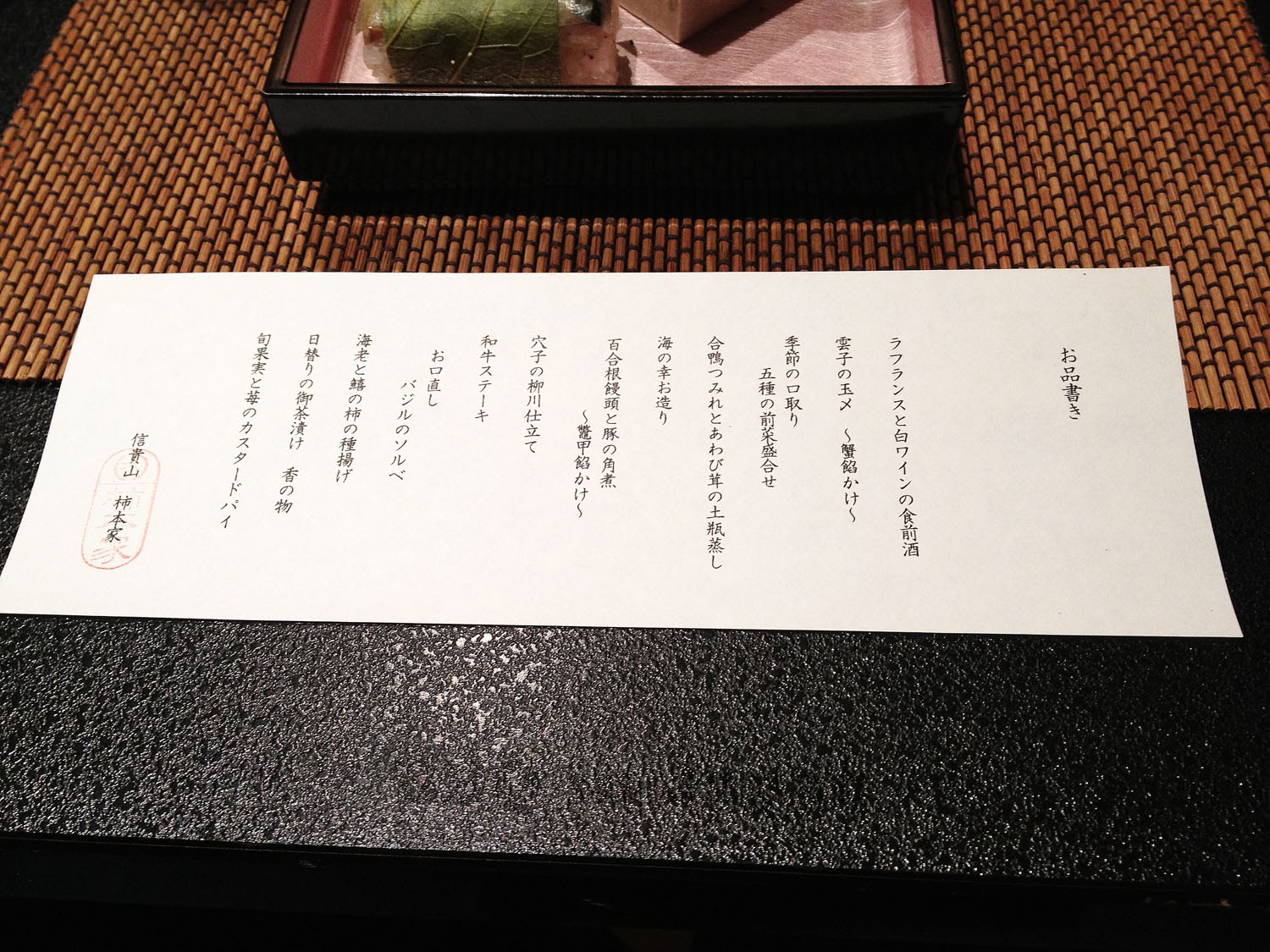 吃完前菜後拿起套餐的內容來看…數一數竟然有12道菜!總合了房間內的環境、用餐的環境、以及剛吃完的前菜,讓我們都非常的期待之後將端上桌的10道菜。(前菜和餐前酒各算一道)