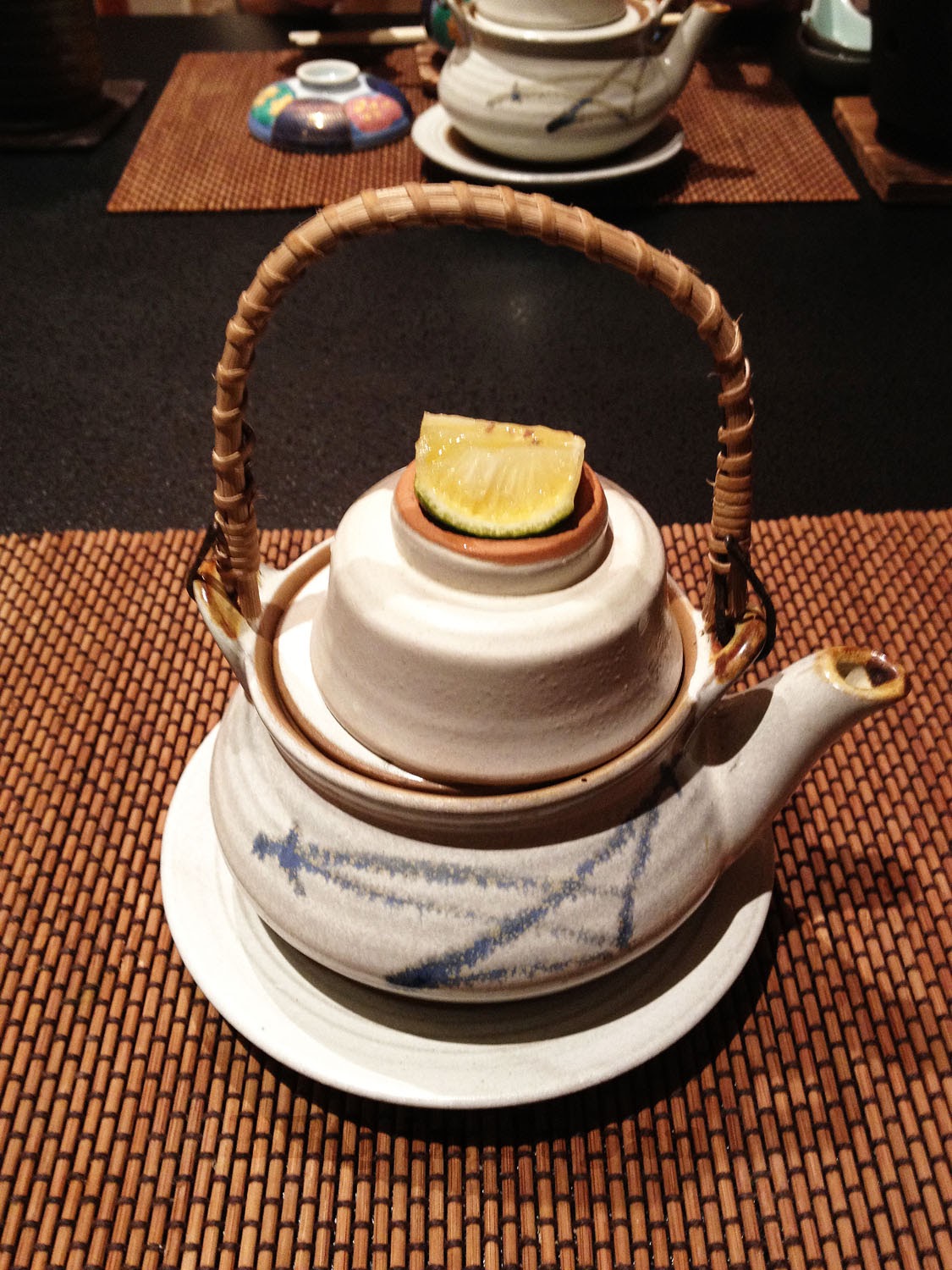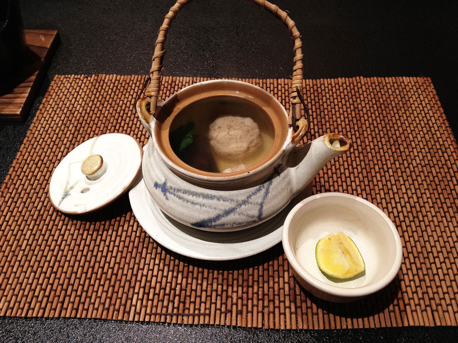 第4道菜是鴨肉丸子與あわび茸(鮑魚菇?)的土瓶蒸鴨肉丸子咬起來很有嚼勁,不過吃不太出來是鴨肉,湯喝完嘴裡不會有乾澀的想喝水的感覺,並且讓人整個身體溫暖起來。