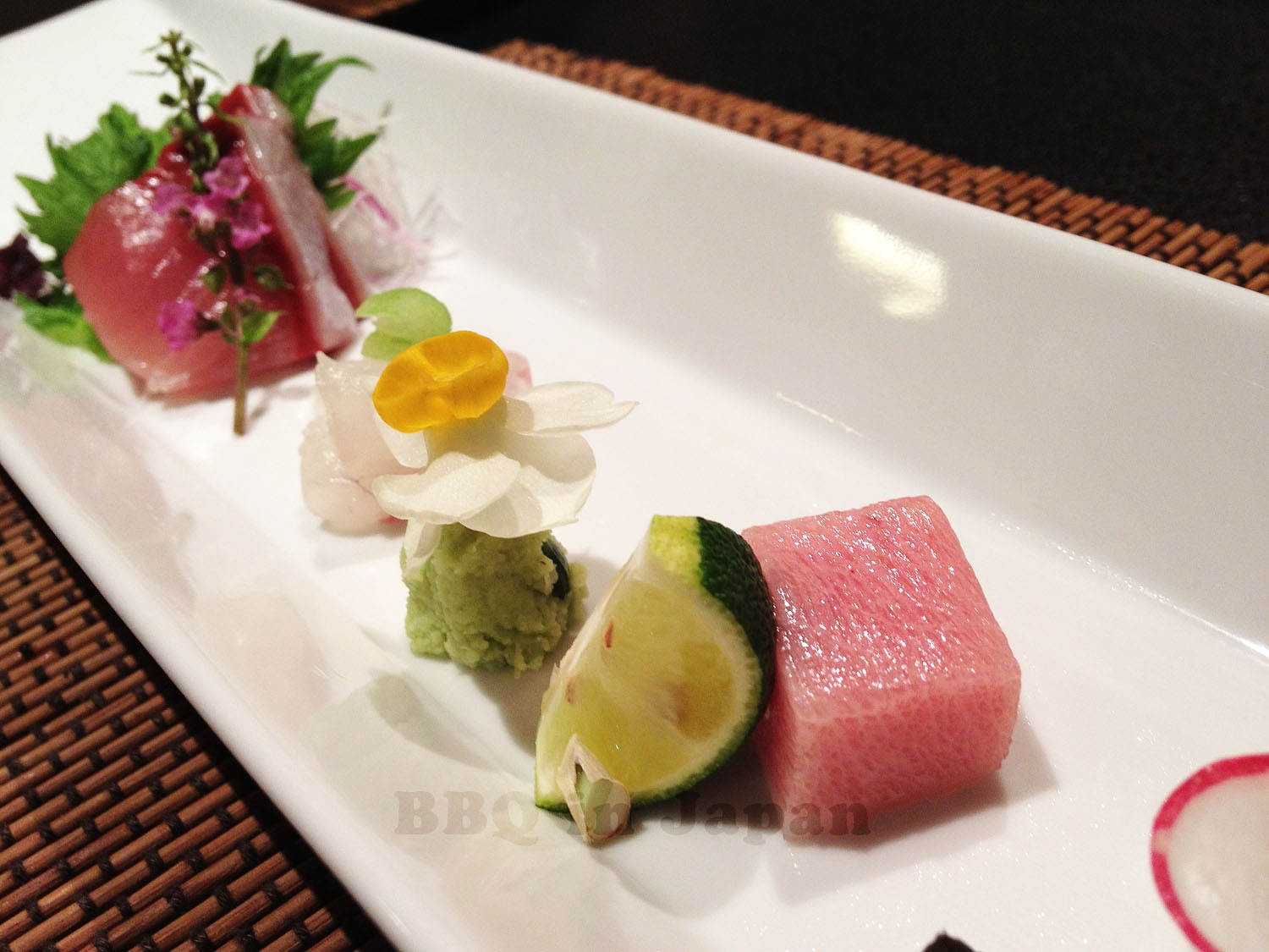 第5道菜是生魚片。原本以為就是很平常的鮪魚、鮭魚、鰯魚、はまち等等的組合,沒想到端出來的竟然有中トロ!那美麗的油花…如果女將告訴我那是最高級的松坂牛肉我也會相信吧!雖然其他的生魚片也都新鮮美味,但是完全無法與中トロ相比啊。這道菜的主角雖然是生魚片,但是個人習慣是吃生魚片前生品嘗一下配角-山葵,而山葵當然也沒讓我失望,不止夠嗆夠辣,還有一股新鮮現磨的山葵會有的香味,結果光吃山葵就吃了好幾口。