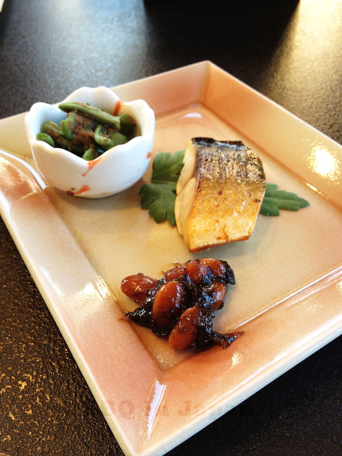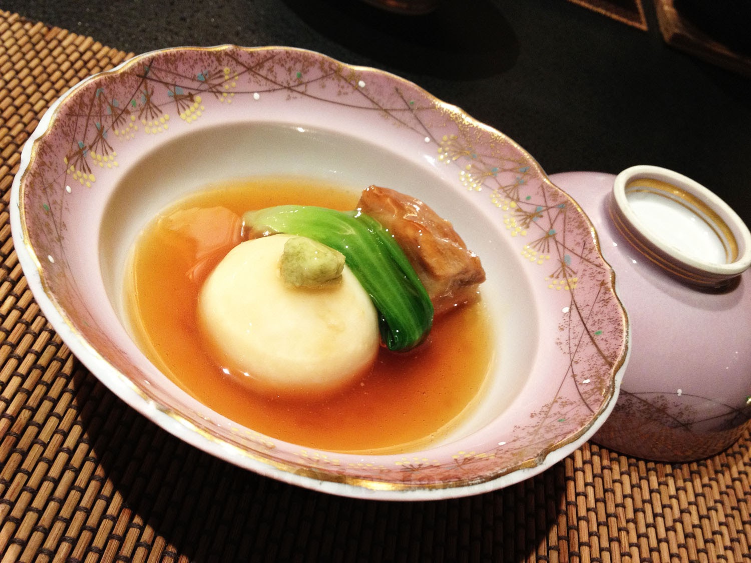 第6道菜是百合根饅頭與滷豬肉。用來盛裝這道菜的餐具是個紫色的大碗,加上裡頭的料理,整道菜似乎是走中國菜的風格。百合根饅頭是將百合根攪成泥後再捏成饅頭的形狀,饅頭的部份很稠密,而饅頭裡似乎包著鼈肉,不過當下吃不出來@@滷豬肉對我們平常就吃慣中華料理的人來說,就比較普通一點了。不過因為滷的很入味,肉質也不錯,整個不會輸給中式餐廳。