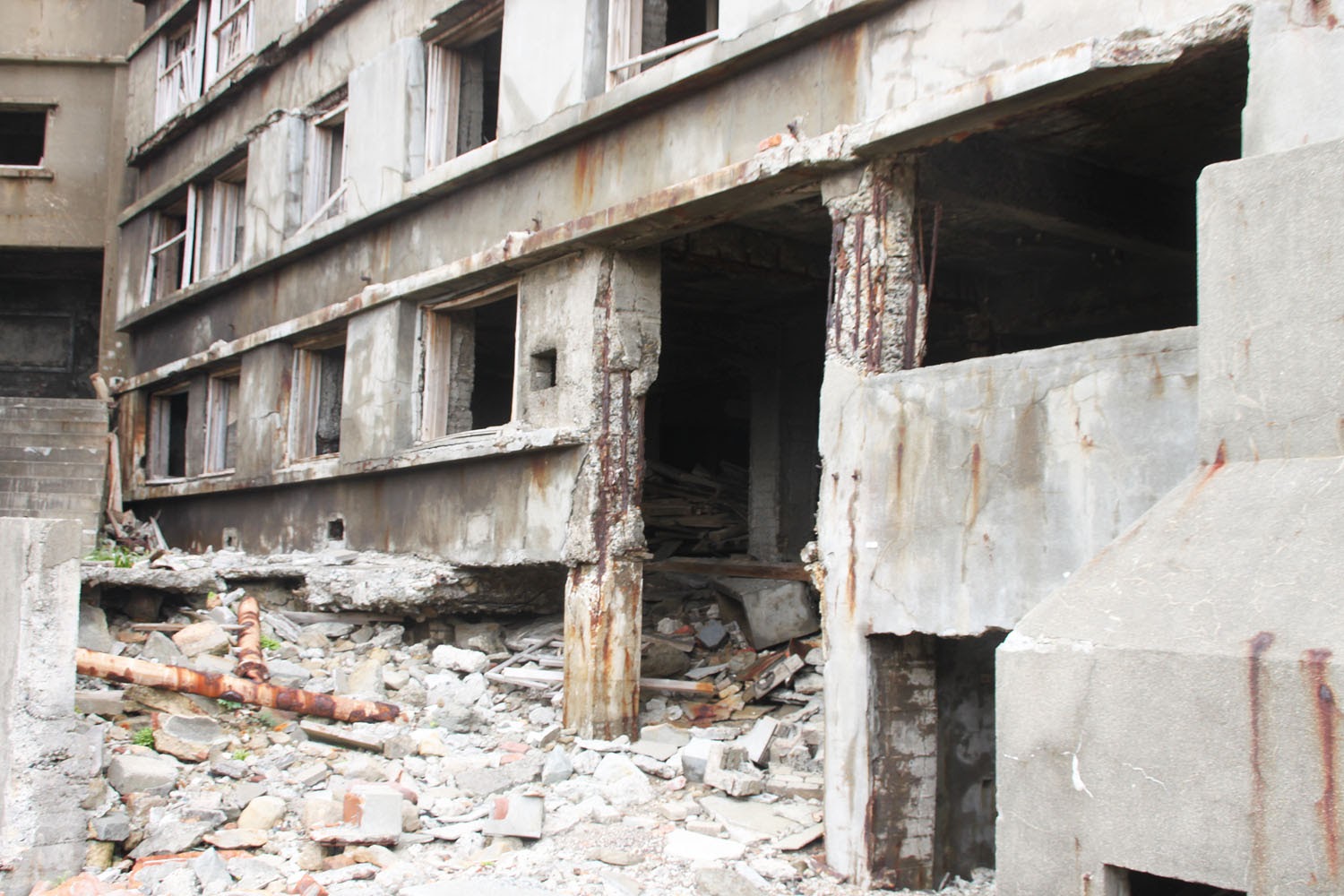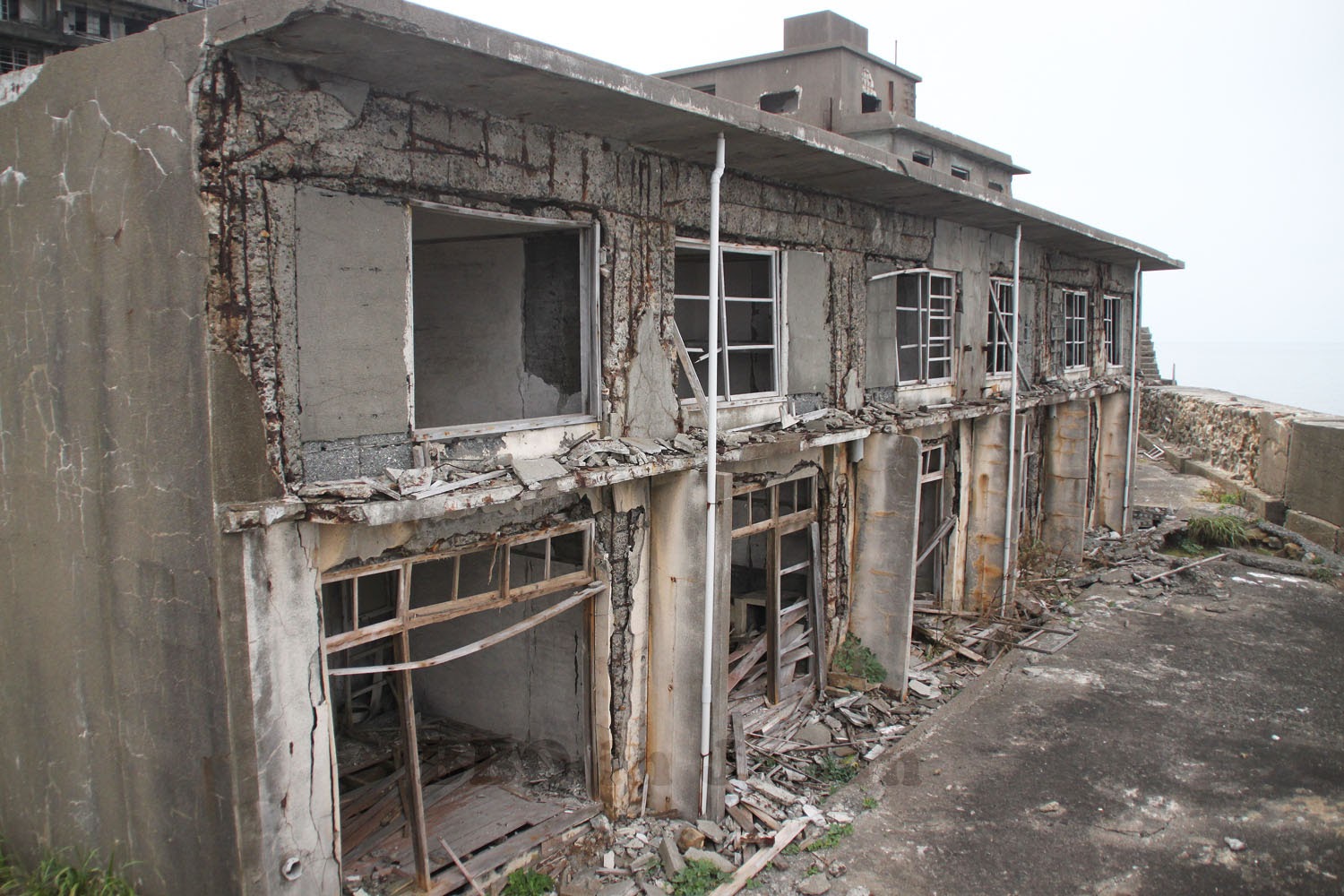 ㉜ 從左到右為65號棟(鑛工宿舍+屋頂幼稚園-1945年)→67號棟(鑛工宿舍-1950年)→69號棟(端島病院-1958年)