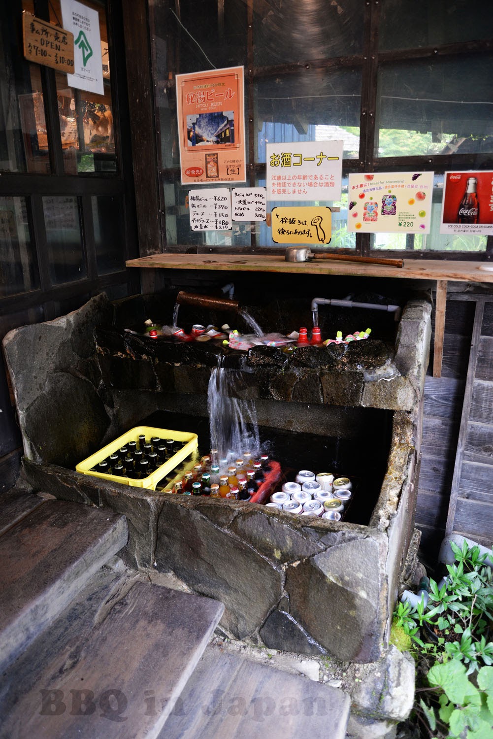 大門前的右手邊放了一堆正在用天然冰水冰鎮中的飲料、酒,一罐500ml的罐裝啤酒要價530円…