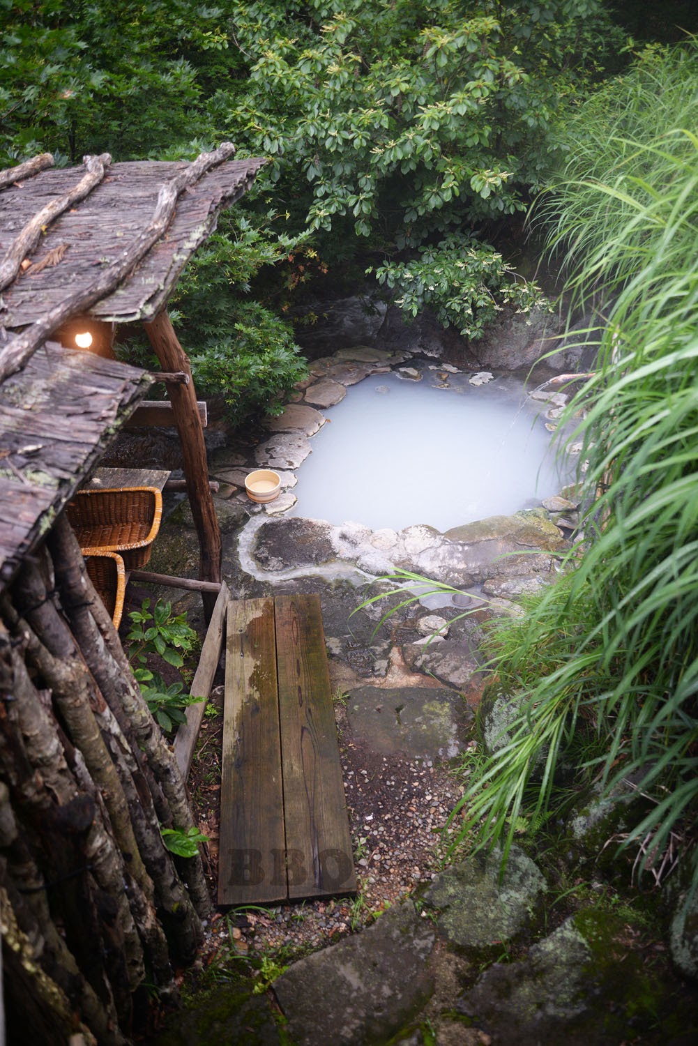 羊腸小徑裡已經有溫泉,溫泉又是很濃的乳白色,所以壓低身子後基本上除了脖子以上什麼都看不到,這邊我覺得鶴之湯的設計者真的很用心(那個酸湯就………)。